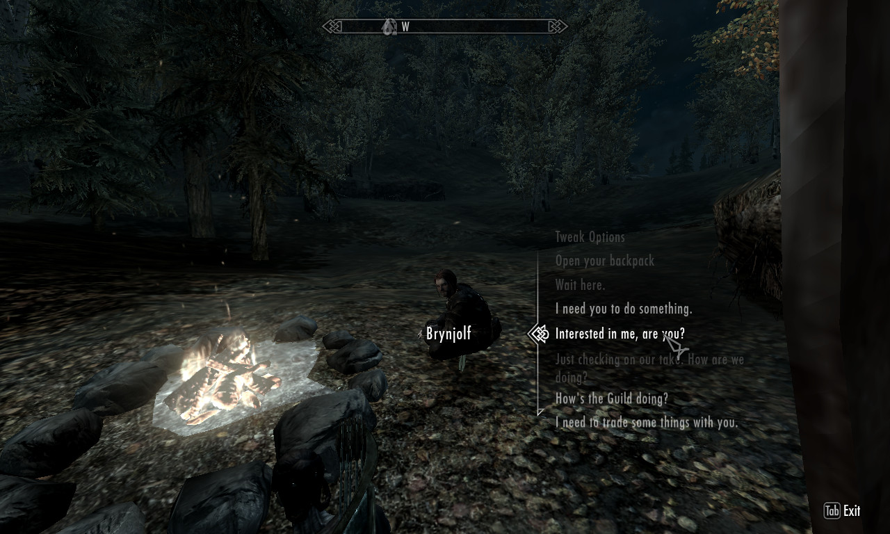 Well, we found her (or at least a bandit hideout and killed some baddies together – there may have been a couple of wolves killed in there too). That night, we were quite tired and didn’t have the oomph to return to Riften in the dark. We decided to camp for the night instead. As we had eliminated the threat to my life, who turned out to be the bitter ex-girlfriend – she had decided she shouldn’t have given him up after all – we had a quiet moment to discuss our future.